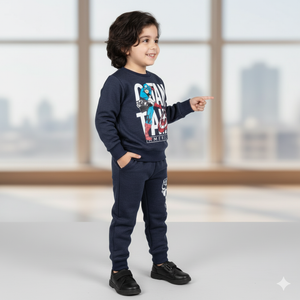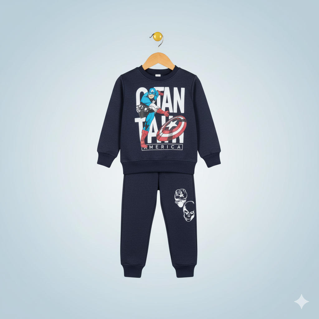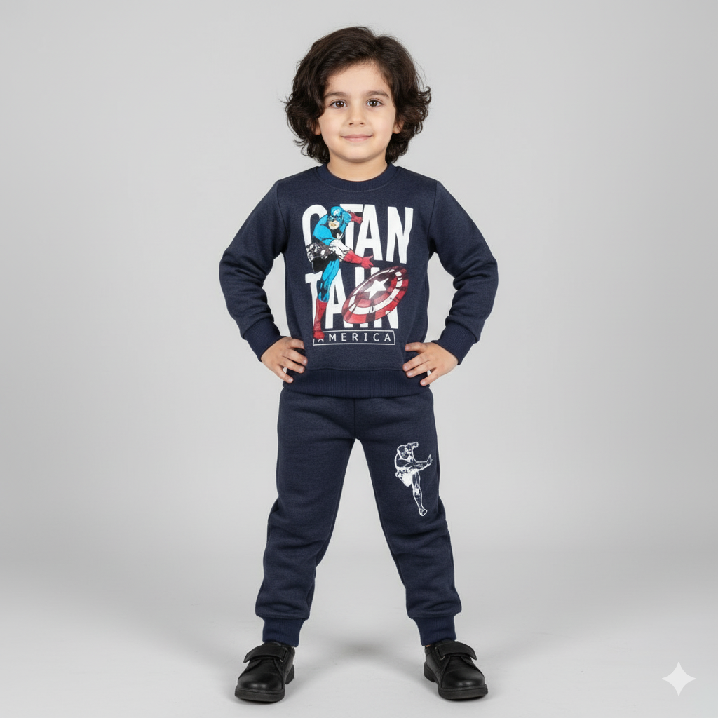 Bring superhero energy to your child’s wardrobe with this Boys Captain America Fleece Tracksuit Set. Featuring a bold Captain America graphic sweatshirt with shield design and matching pants, this outfit is perfect for kids who love Marvel superheroes. Crafted from soft, warm fabric, it’s ideal for winter wear, casual outings, school, and playtime.