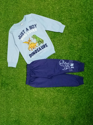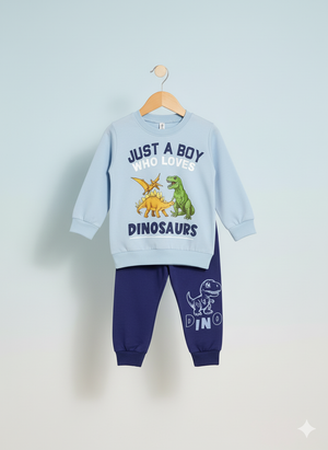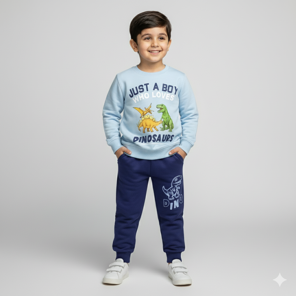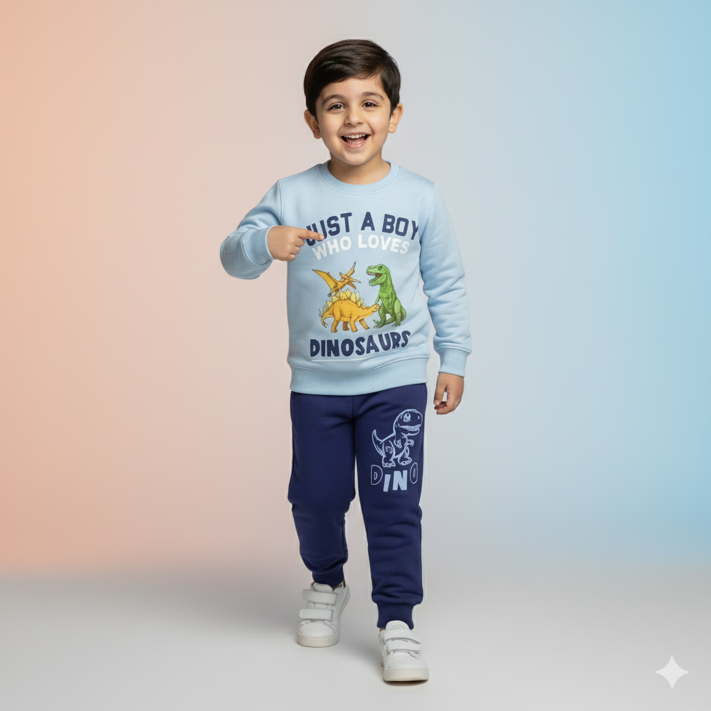 Let your little one show off his love for dinosaurs with this adorable Boys Dinosaur Sweatshirt Tari fabric and trouser Tari fabric set . The outfit includes a soft pink sweatshirt featuring colorful dinosaur graphics with the text “Just a Boy Who Loves Dinosaurs”, paired with maroon jogger pants printed with a fun dino design. Perfect for playtime, school, and casual winter wear, this set combines comfort and style.