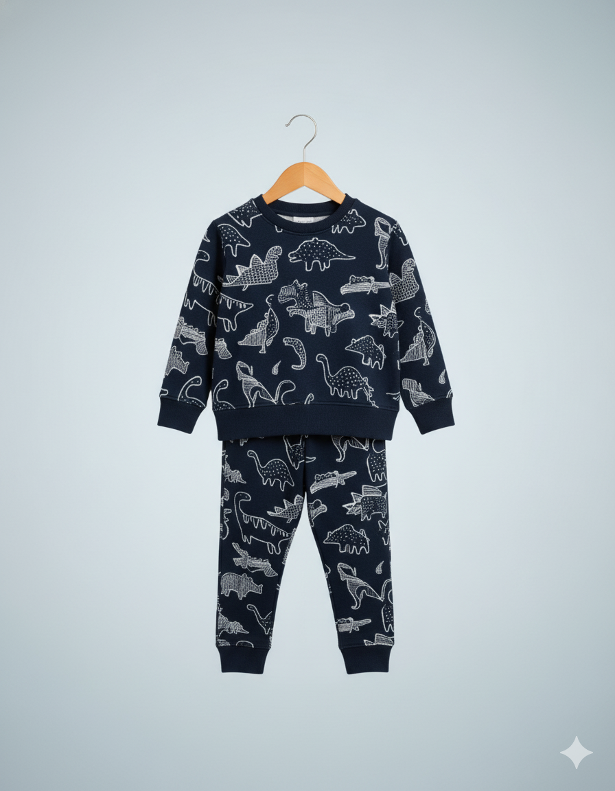 Fun Design: Navy blue tracksuit with all-over white dinosaur prints.