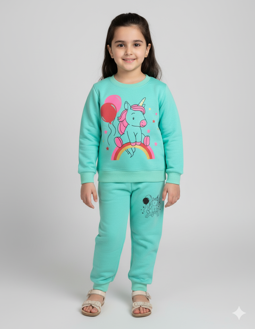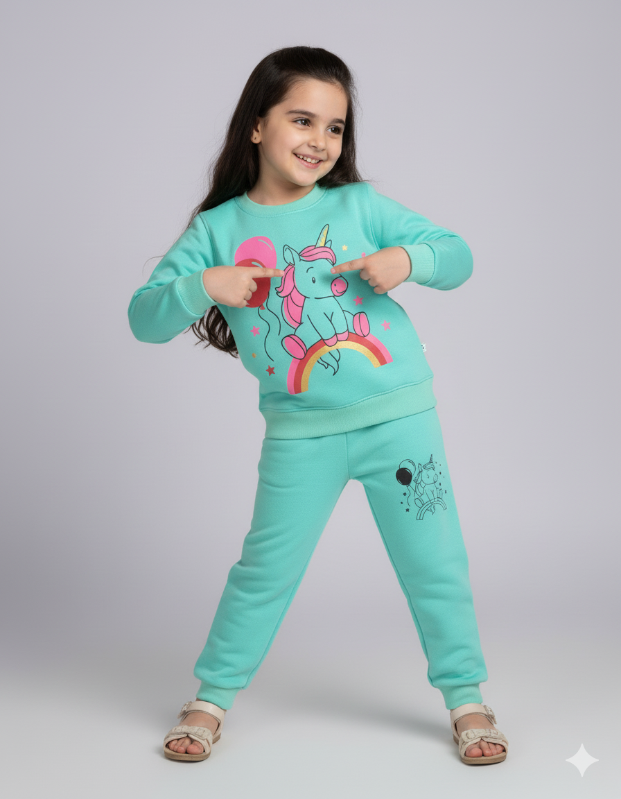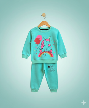 mbrace winter enchantment with our Celestial Cyan Unicorn Bliss Set—a magical two-piece tracksuit designed for dreamy days. The cyan color sets the stage for a whimsical journey, while the unicorn picture adds a touch of fantasy to your little one's winter wardrobe. Crafted from excellent-quality warm and soft fleece, this ensemble ensures unparalleled comfort during chilly days. The impeccable stitching not only enhances durability but also adds a touch of craftsmanship to the design. A perfect two-piece for the season, the Celestial Cyan Unicorn Bliss Set promises the ideal fusion of comfort and magic for your little one's winter adventures.