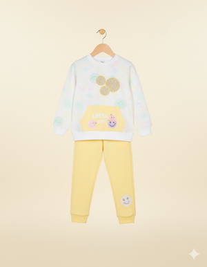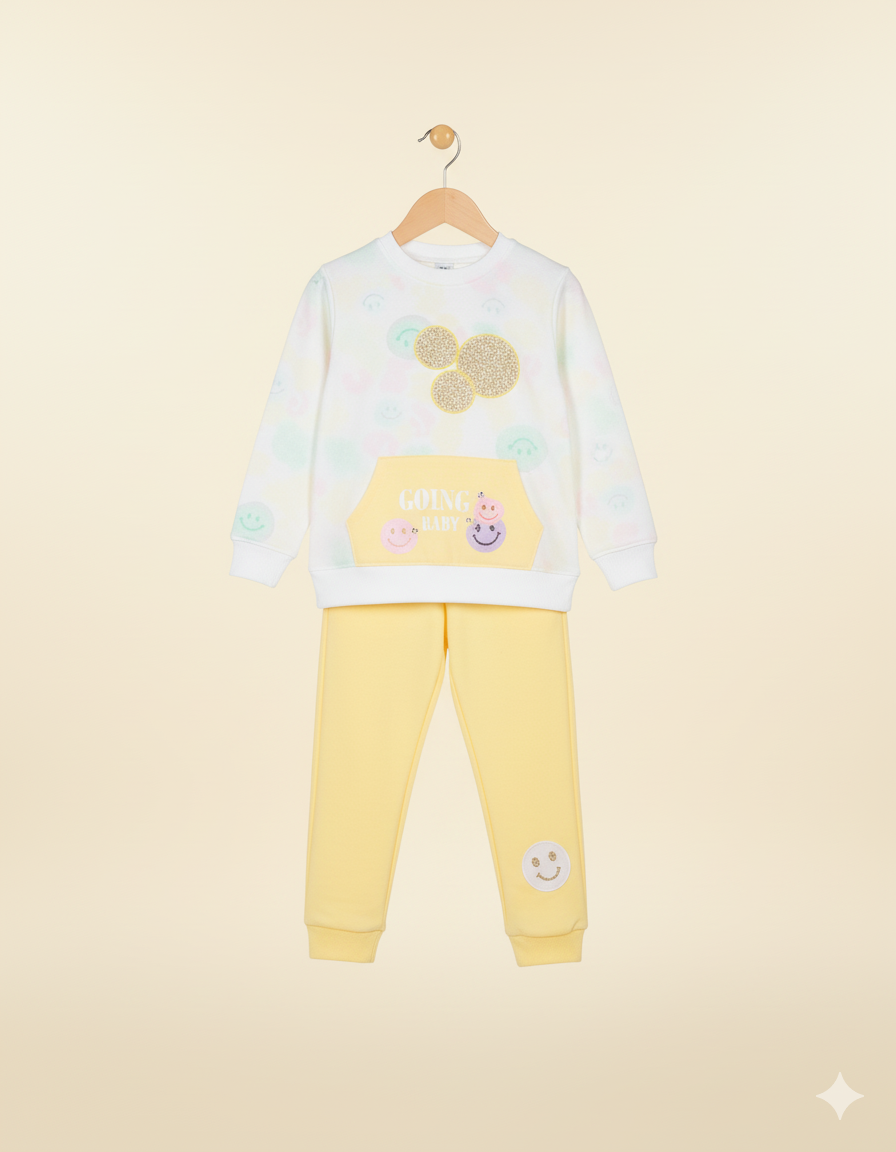 This adorable two-piece outfit features a soft white sweatshirt printed with colorful smiley faces and a glittery design, paired with bright yellow fleece joggers for a cheerful, cozy look.