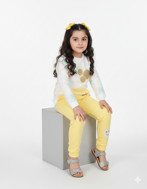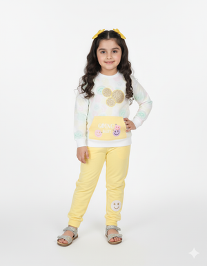 Cute Smiley Winter Tracksuit for Girls | Yellow & White Fleece Set with Glitter Design