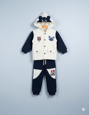 Keep your little one cozy and stylish this winter with our Cute Teddy Bear Winter Tracksuit Parashot fabric inner fleece sleeve, fleece fabric trousers fleece in elegant cream white. Crafted from premium soft fleece fabric, this two-piece set features an adorable teddy bear wearing a beanie and goggles on the sweatshirt, paired with matching jogger pants printed with “Cool Young” for a playful touch.