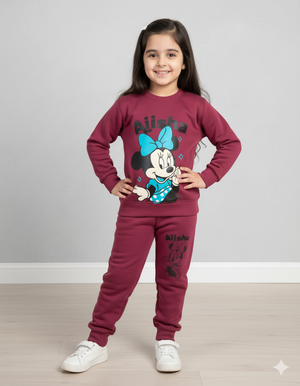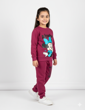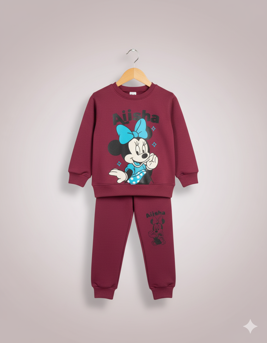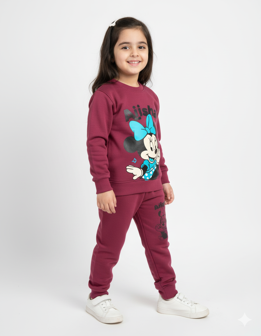 Cute Minnie Mouse Maroon Fleece Sweatshirt & Trouser Set for Girls | Winter Warm Outfit