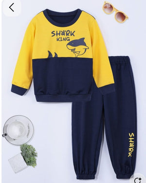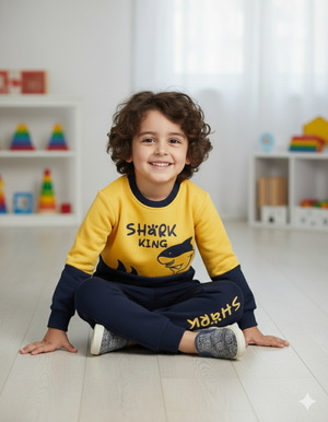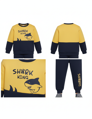 Dive into adventure with our "Shark King" two-piece tracksuit! This adorable and comfortable set features a vibrant yellow and navy blue color block design, complete with a friendly shark graphic and "Shark King" lettering. Made from soft, breathable fabric, it's perfect for playdates, school, or just lounging around. The long-sleeve top and matching elastic-waist pants offer a relaxed fit, ensuring your little one stays comfy all day long. Let them rule the playground in style and comfort