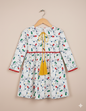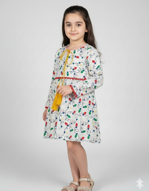 Girls White Printed Frock | Colorful Light Bulb Design Dress with Yellow Tassels