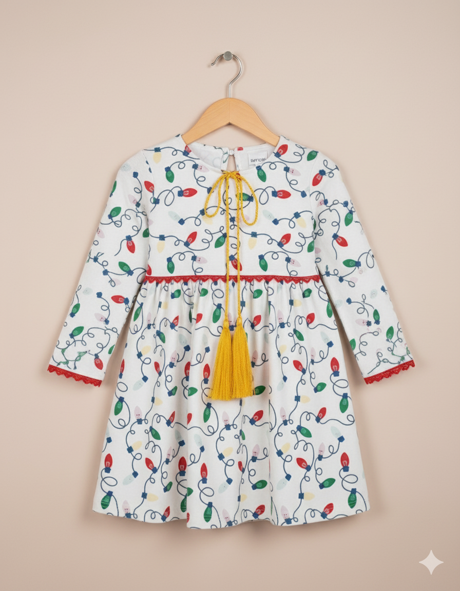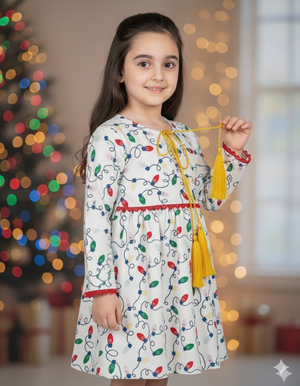Bright and playful, this Girls White Printed Frock is designed to add charm to your little one’s wardrobe. Featuring a fun colorful light bulb pattern across the fabric, it brings a festive and stylish vibe. The frock includes long sleeves with red lace edging and a waist tie adorned with yellow tassels, giving it a trendy and eye-catching finish.