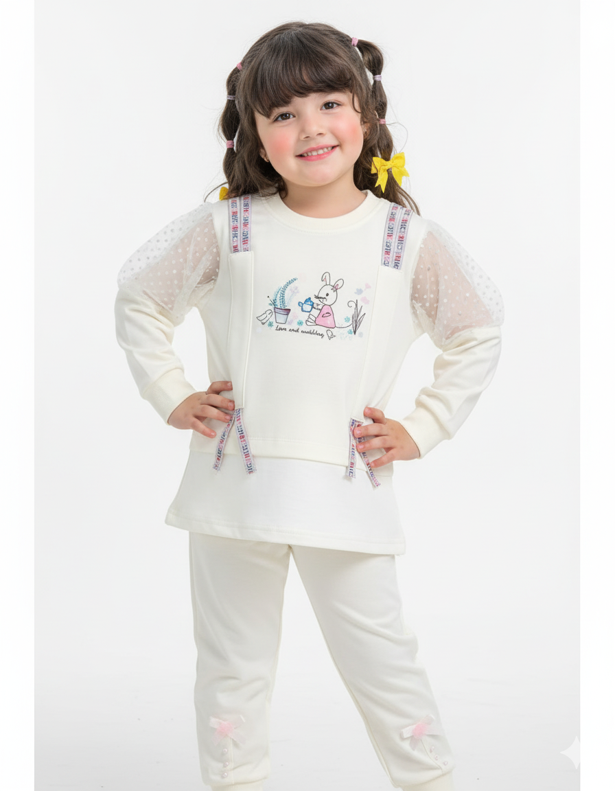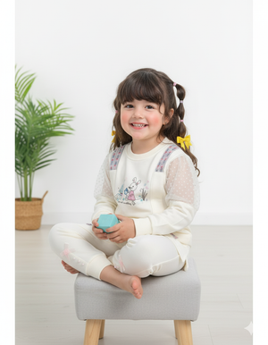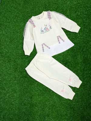 Give your little princess a chic winter look with this Girls White Fancy Pre-Winter Set. The top features trendy net puff sleeves, colorful strap accents, and an adorable bunny print design for a playful touch. Paired with soft matching joggers decorated with cute bow and button details at the cuffs, this outfit combines comfort with style, making it perfect for both casual wear and special outings.