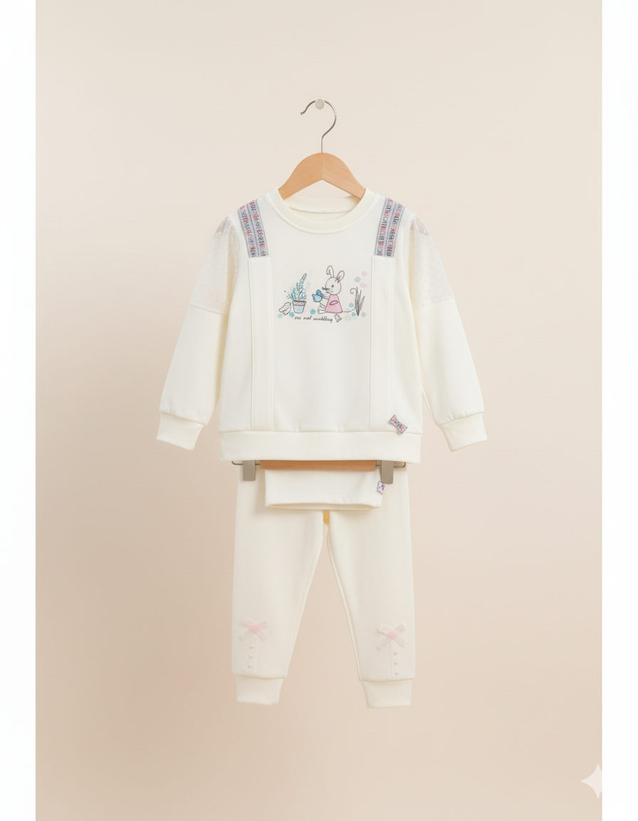 Girls White Fancy Pre-Winter Trendy Set | Cute Bunny Print Outfit with Stylish