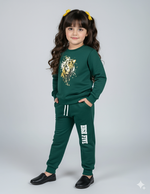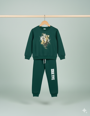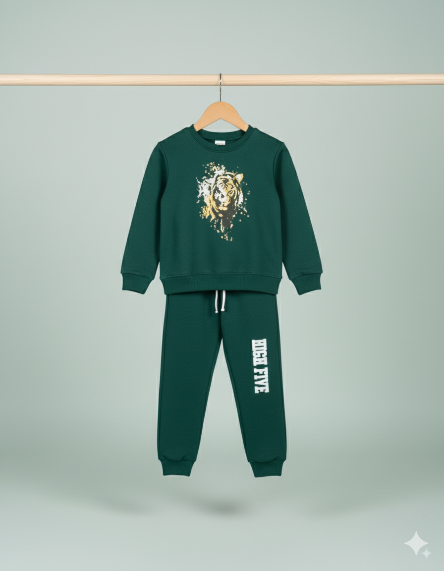 Bring out the bold style in your child with this Kids Green Sweatshirt & Jogger Set. Featuring a striking tiger graphic print on the sweatshirt and bold “High Five” text on the joggers, this 2-piece outfit is designed for kids who love trendy and adventurous looks.