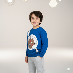 Add fun and comfort to your child’s wardrobe with this Kids Blue Sweatshirt & Grey pant fleece Set. The sweatshirt features a playful bear print inside a round graphic strap design, making it trendy and adorable. Paired with soft light grey pants with elastic waist and cuffed hems, this outfit is perfect for winter wear, school, playtime, and casual outings.