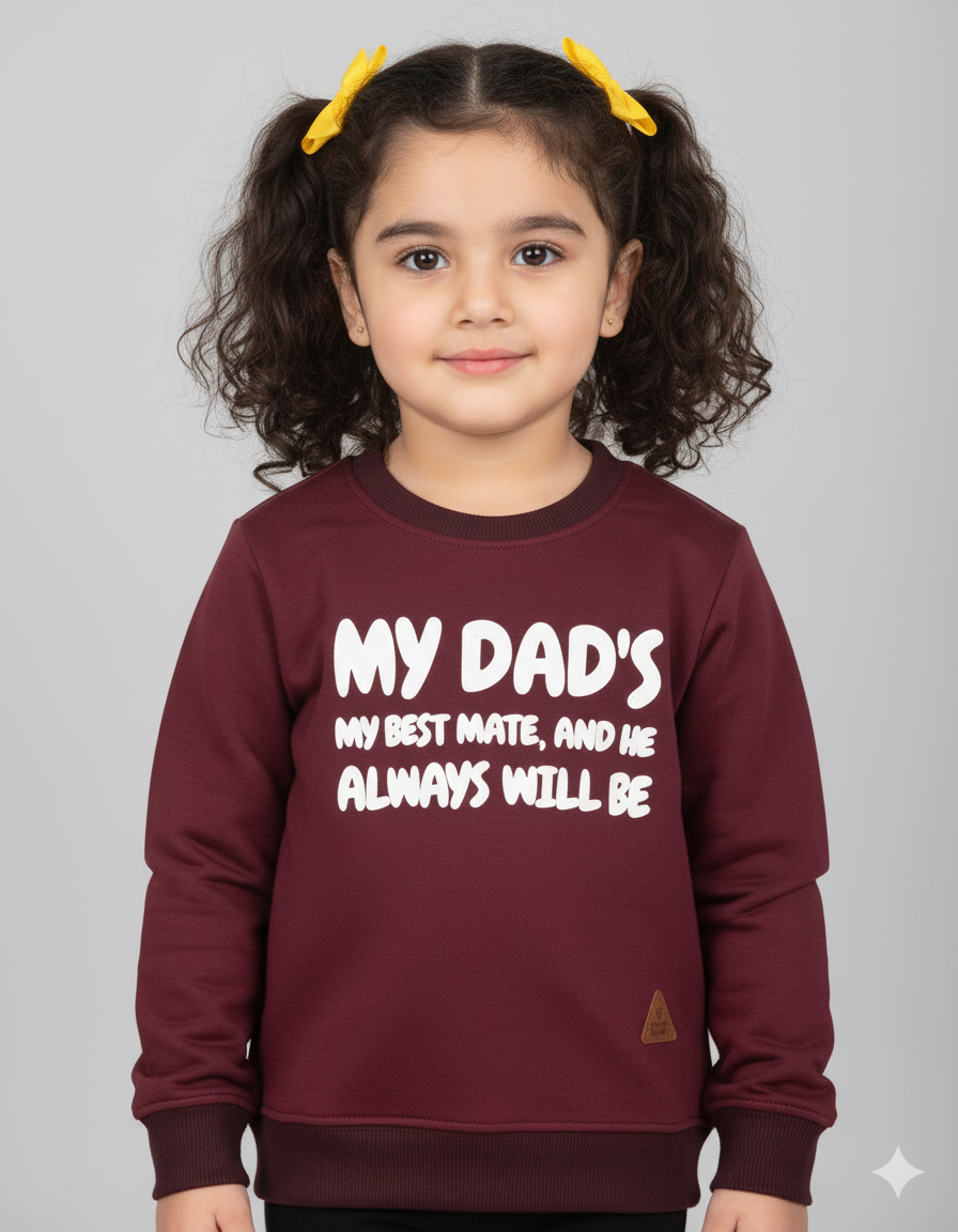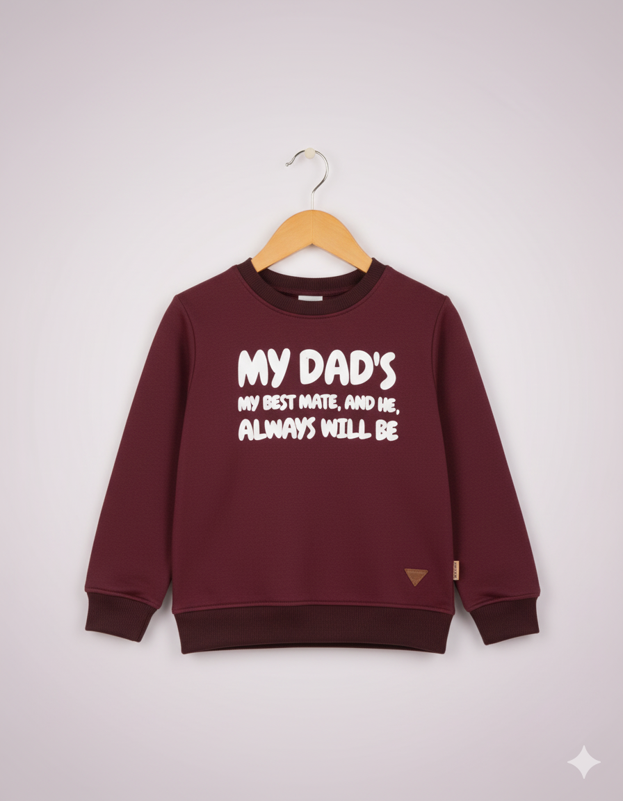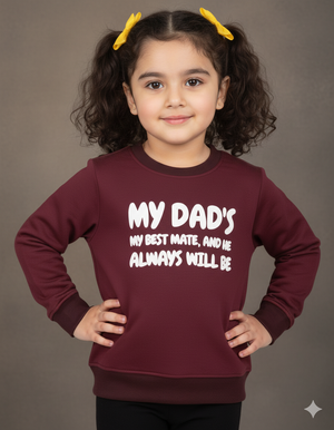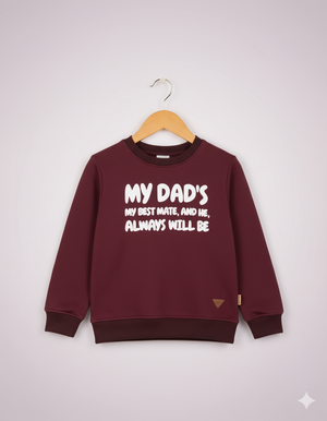 Celebrate the bond between father and child with this Kids Maroon Sweatshirt featuring the heartfelt slogan “My Dad’s My Best Mate, And He Always Will Be.” This cozy pullover combines warmth, comfort, and a meaningful message, making it perfect for everyday wear.