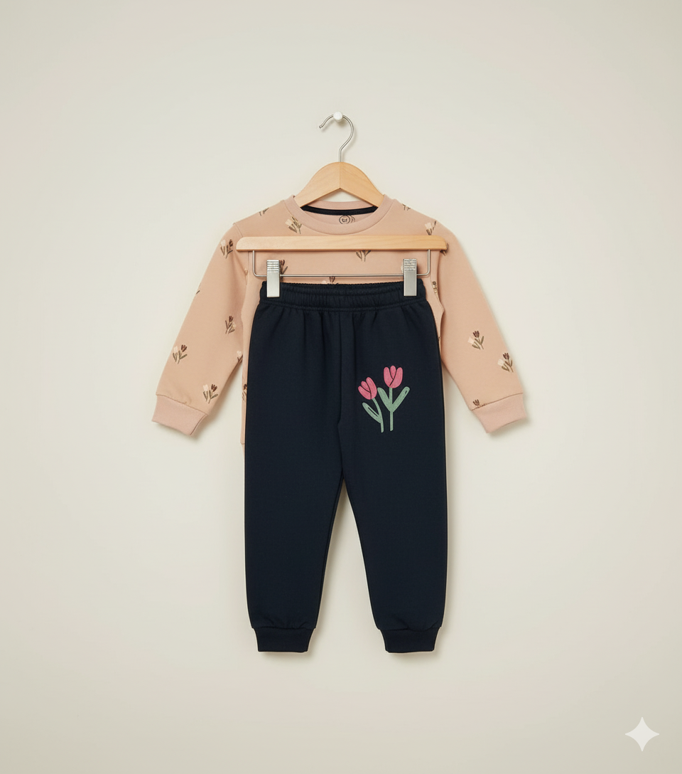 Add charm and comfort to your child’s winter collection with this Kids Peach Sweatshirt & Black Jogger Set. The peach sweatshirt features a delicate all-over floral print, paired with stylish black jogger pants decorated with a cute tulip flower design. Perfect for little girls who love both comfort and style.