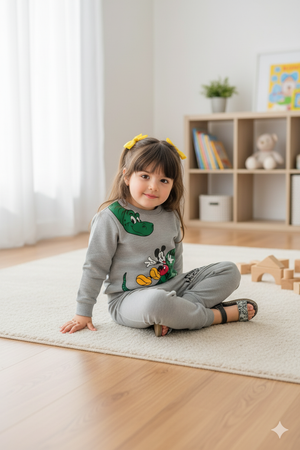 Make your child’s winter wardrobe extra fun with this Dino Mickey Tracksuit! This adorable grey Winter Outfit set features a playful print of Mickey Mouse riding a dinosaur, making it a perfect pick for kids who love cartoons and adventure.
