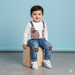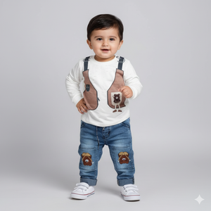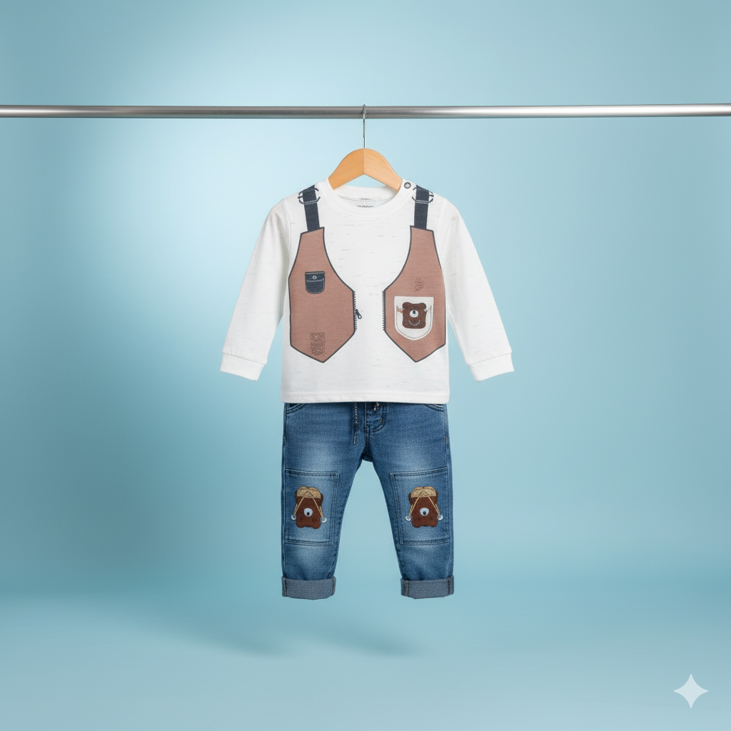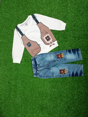 Give your little boy a trendy and comfortable look with this Boys Denim Sweatshirt Tari fabric and denim pant set pre-winter Set The outfit includes a stylish white sweatshirt with printed backpack and bear graphic design, paired with blue denim pants featuring cute bear patches on the pockets. Perfect for casual wear, school, and outdoor activities, this set blends comfort with playful fashion.