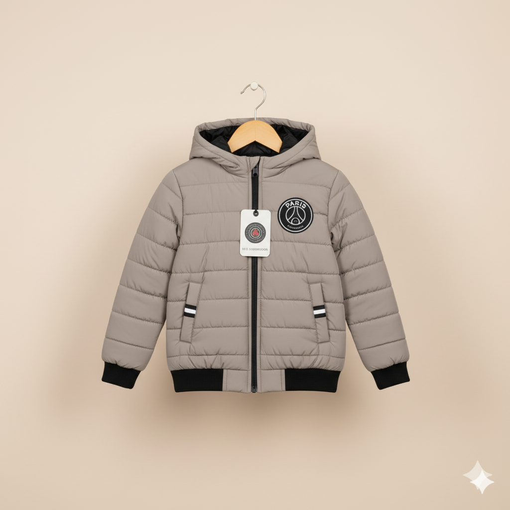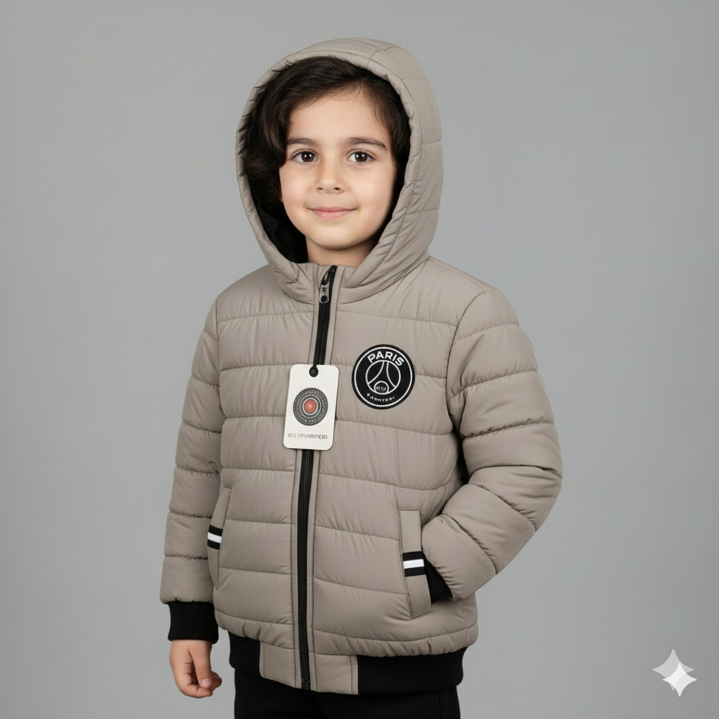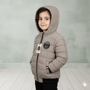 Keep your little one cozy and stylish this winter with our Boys Light Grey Puffer water proof Jacket with Hood. Designed with a premium quilted finish and soft inner lining, this jacket offers exceptional warmth without adding bulk. The Paris embroidered badge on the chest adds a trendy touch, making it a perfect choice for both casual outings and winter adventures.