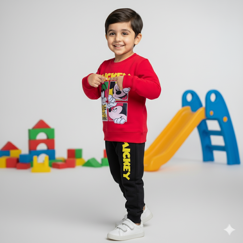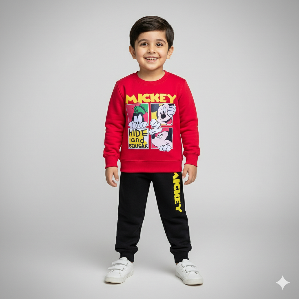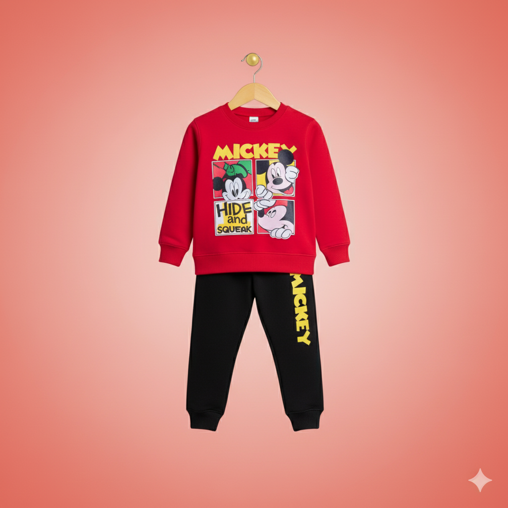 Keep your little one warm and stylish with our "Mickey Magic Winter Tracksuit." This vibrant red tracksuit features a playful Mickey Mouse character print and comfortable black trousers. Crafted with meticulous stitching and soft fleece lining, it ensures coziness all season long. Easy to care for and perfect for winter adventures!