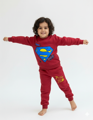 Mini Minors || Maroon Superman || Soft Winter Fabric two-piece ensemble designed with a comfortable and soft winter fleece fabric  Crafted for comfort and style, this set features excellent stitching and is made from premium warm fleece. Let your child explore the season in cozy warmth and iconic fashion with the Mini Minors || Maroon Superman || Soft Winter Fabric, the perfect blend of comfort and quality
