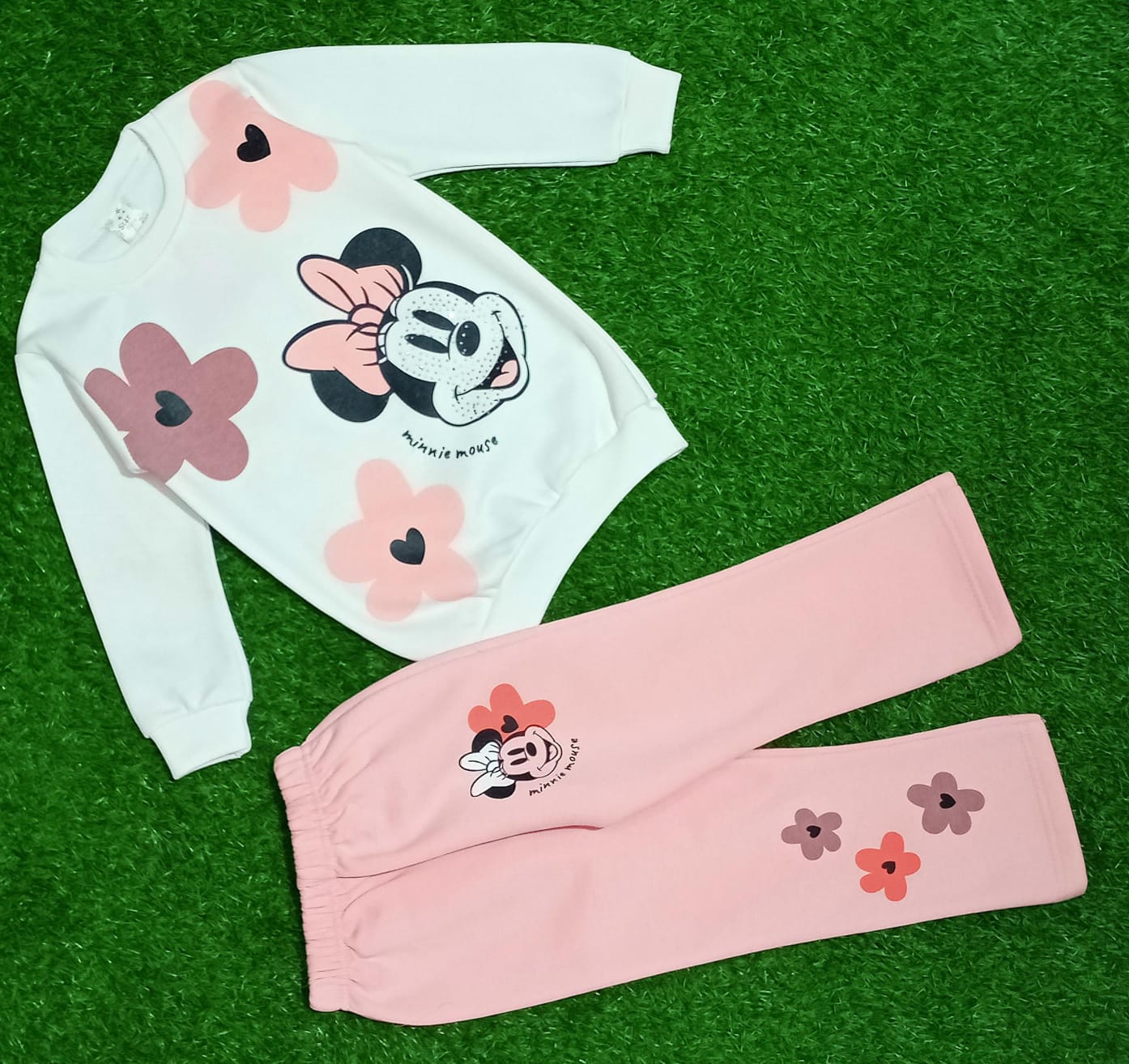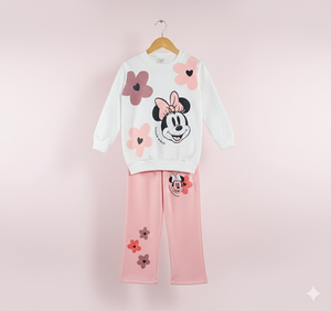 Girls Minnie Mouse Winter Tracksuit – Cute Floral Printed Sweatshirt (Pink & White)