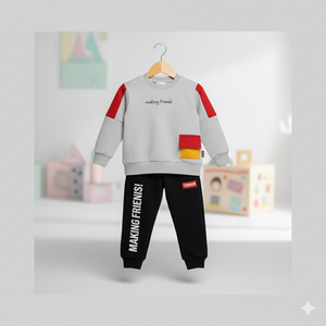 Keep your little one cozy and trendy this winter with our “Making Friends” Boys Winter Tracksuit — a perfect mix of comfort, warmth, and playful style. This 2-piece set features a light grey fleece sweatshirt with vibrant red shoulder and pocket detailing, paired with black trousers that read “Making Friends” for a fun, fashionable touch.