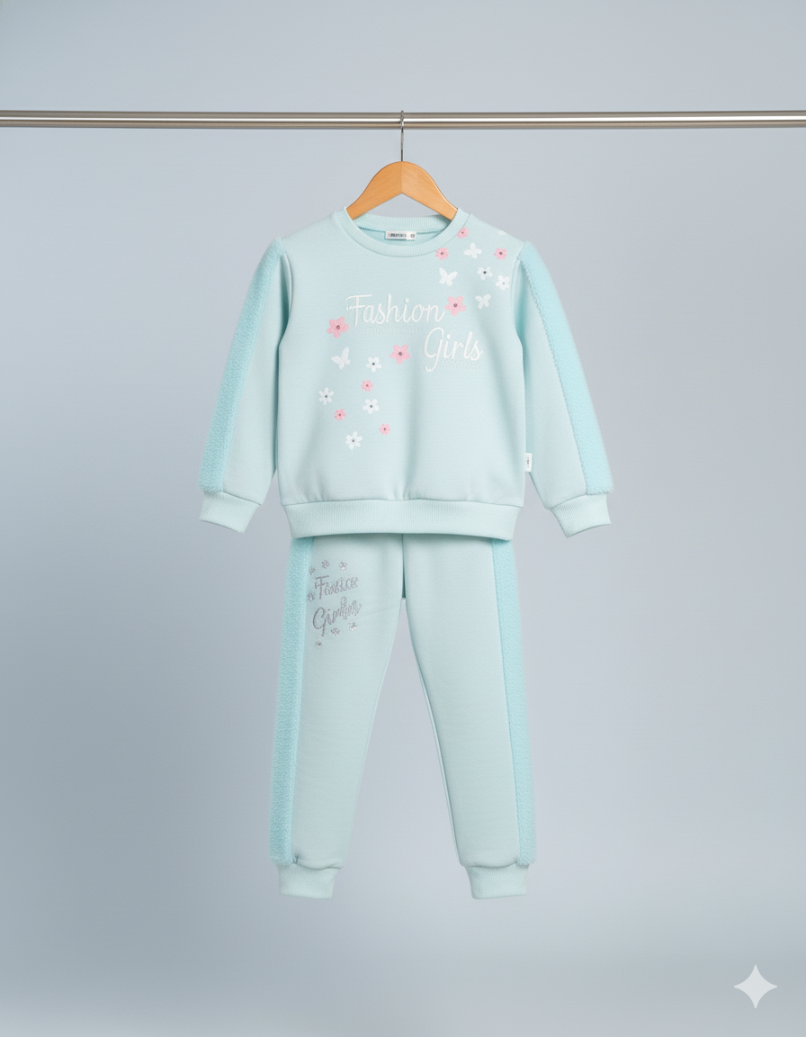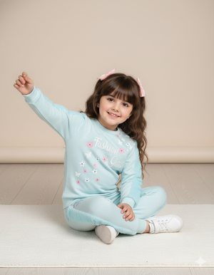 Dress your little princess in cozy elegance this winter with our Fashion Girls Winter Fleece Suit in charming sky blue. This two-piece set features a beautifully embroidered “Fashion Girls” design with 3D flowers, butterflies, and delicate beadwork on the sweatshirt. The matching trousers include a stylish “Fashion Girls Beautiful” print, enhanced with fur-lined sides for extra warmth and flair.