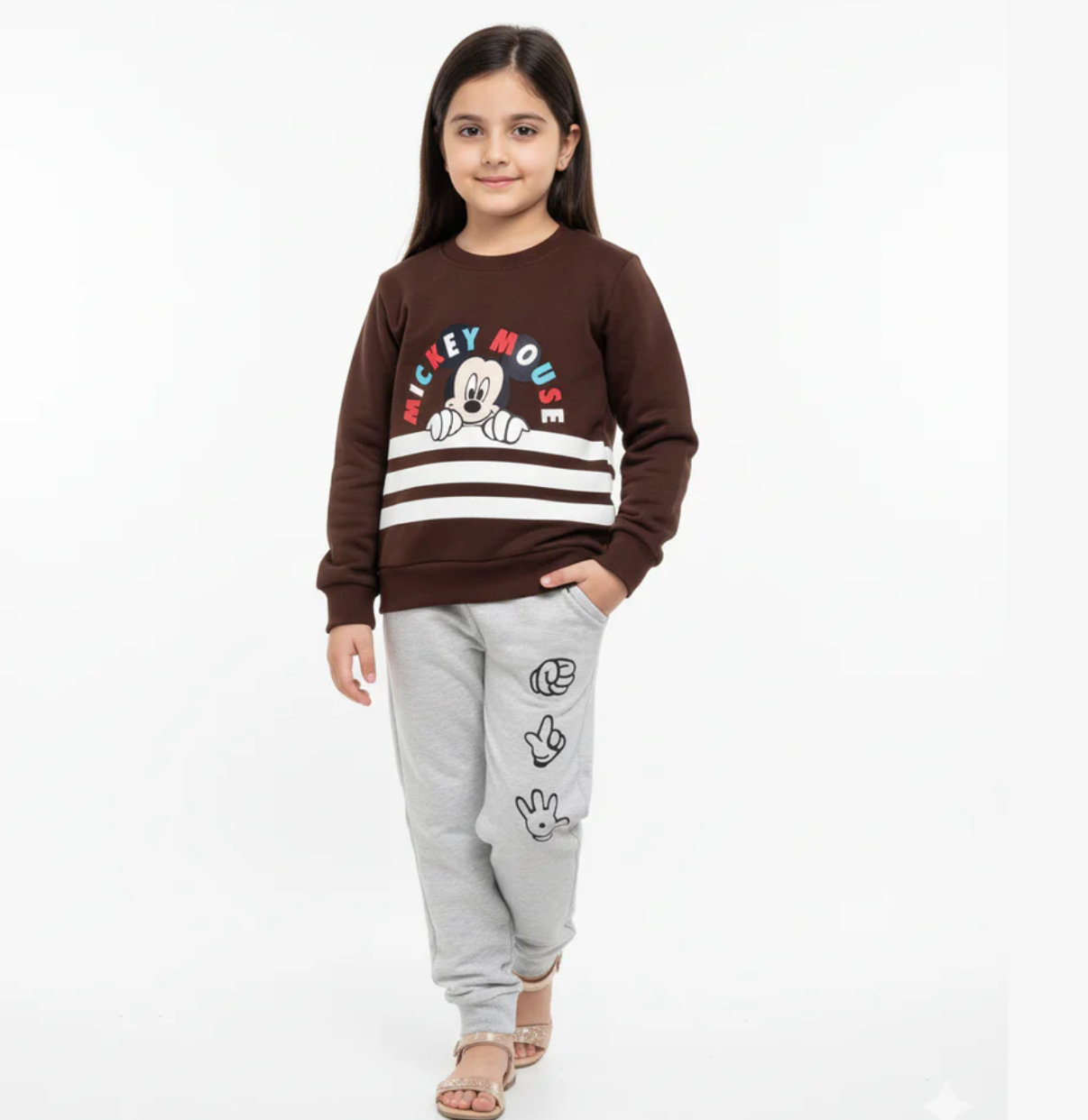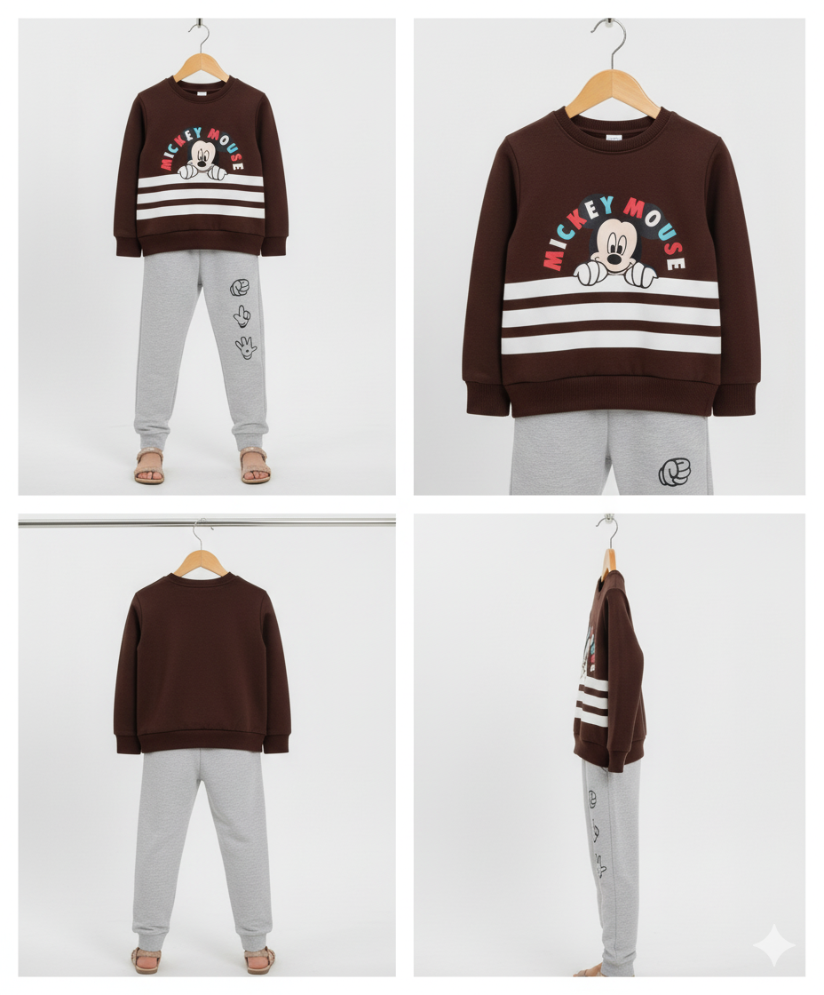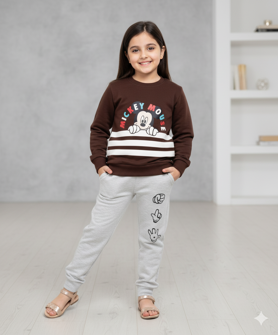 Kids Mickey Mouse Sweatshirt & Jogger Set | Brown & Grey Winter Outfit for Boys & Girls