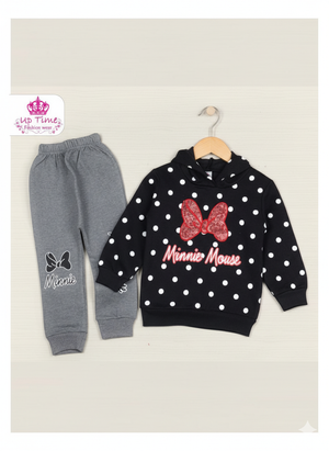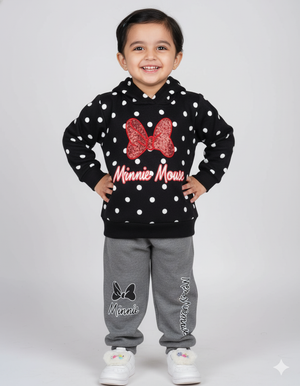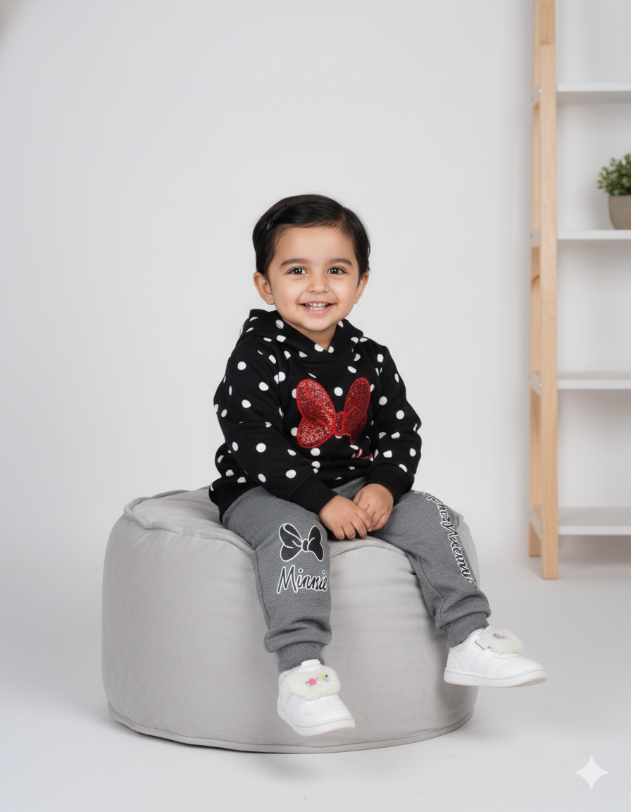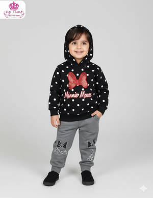 Keep your little princess warm and stylish this winter with our Minnie Mouse Polka Dot Hoodie & for Girls. Crafted from premium three-layer fleece fabric, this adorable 2-piece outfit includes a soft hoodie featuring cute Minnie Mouse text and a sparkling sequin bow design, paired with comfortable grey printed with Minnie’s iconic bow.