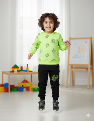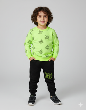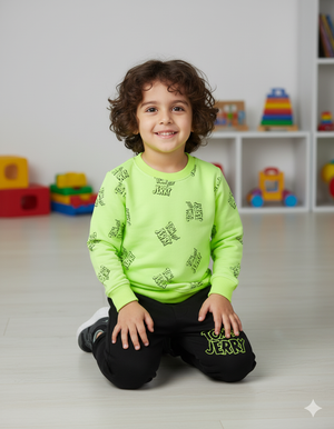 Let your little one embark on a "Tom and Jerry Adventure" with this vibrant Highlight green shirt paired with sleek black trousers. Crafted for comfortable wear, this tracksuit features meticulous stitching and a plush fleece lining to keep them cozy during winter days. Easy to wash and care for, it's a must-have for their winter wardrobe