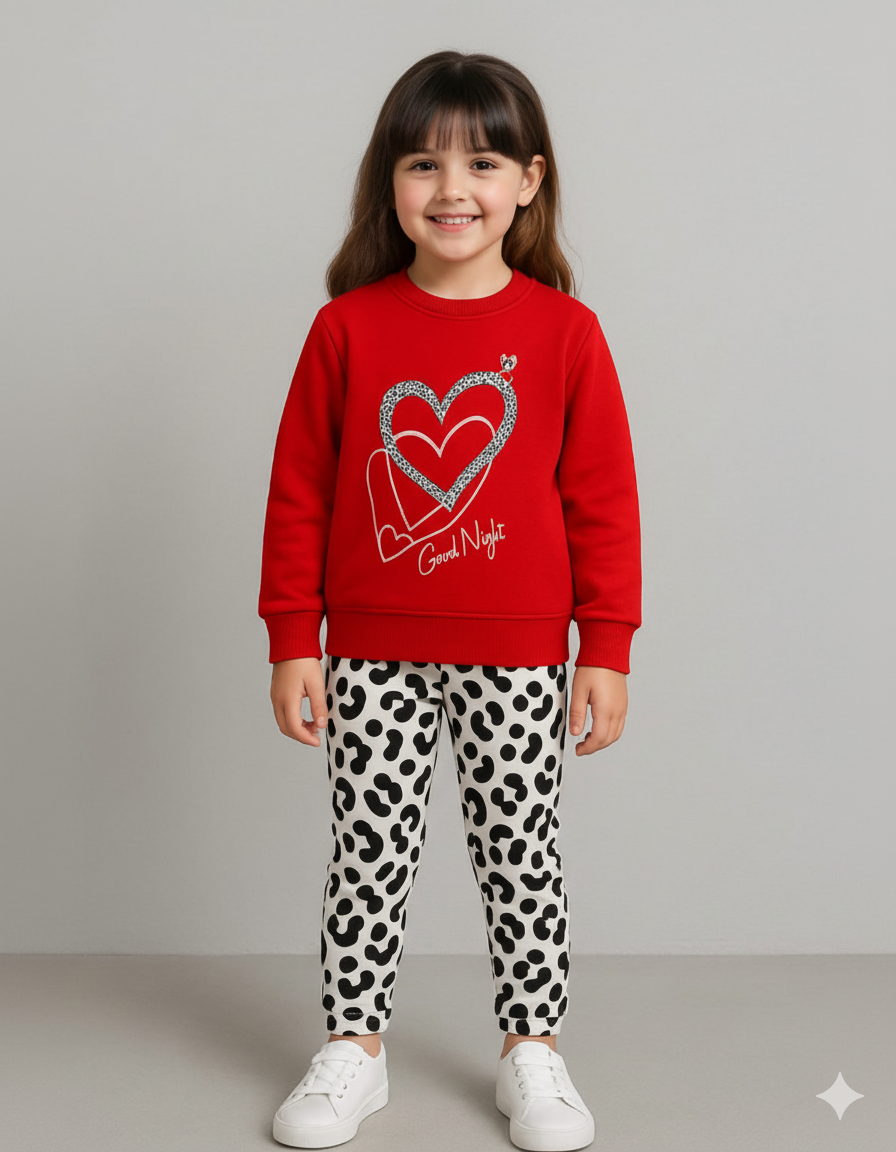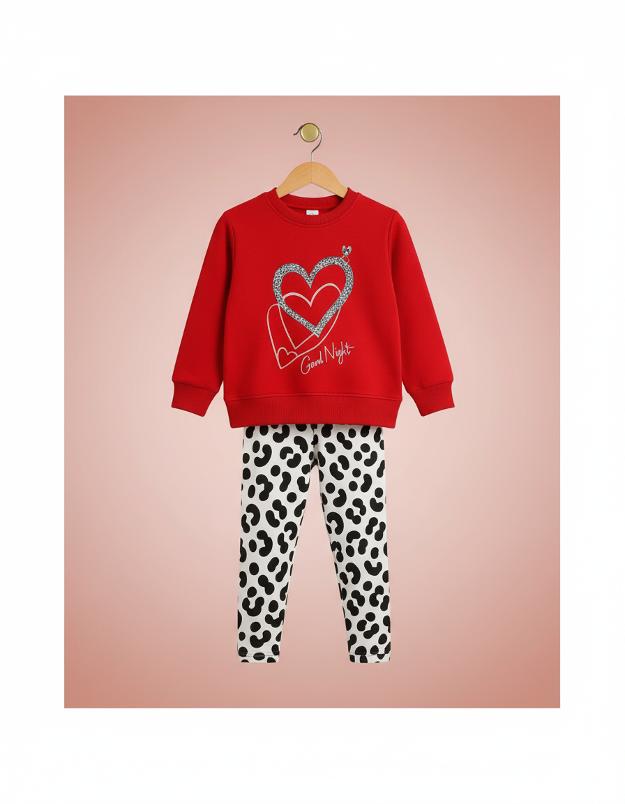 Make your little girl shine in this adorable two-piece winter outfit set, featuring a red heart print stylish paired with trendy black & white polka dot pants. The cozy sweatshirt comes with a sweet heart design and “Good Night” text, adding a playful and loving touch to her look.